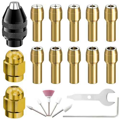 ZHUROUPU ドリルチャックコレットセットは、17点のロタリーツール用アクセサリーで、0.8-3.2mmのシャフトサイズに対応。8mm M8真鍮コレットと金属ナットキット、カーボンブラシも含まれています。