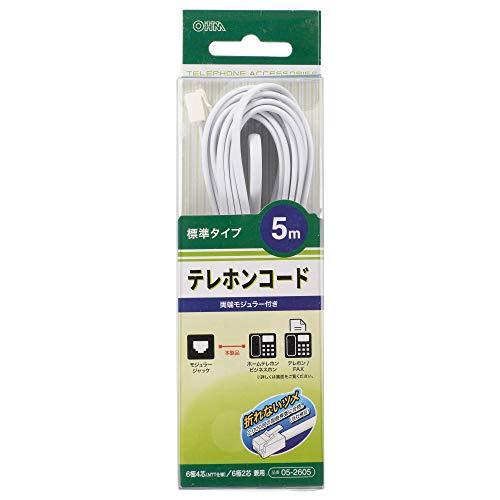 テレホンコード 標準タイプ ホワイト 5m(TEL-C2605W)は、オーム電機製の電話接続用ケーブルです。耐久性に優れた設計で、家庭やオフィスでの使用に最適です。