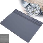 TICFROGの腕時計修理マットは、耐熱シリコン製で1500°Fの耐久性を持ち、スケール定規やネジ位置が明示されています。はんだ付け用の腕時計修理テーブルマットとして便利です。