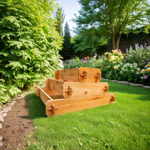 Timberlane Gardensのレイズベッドキットは、ウエスタンレッドシダー製で3段ピラミッド型。各段は1×3、2×3、3×3フィートのサイズで、ほぞ穴とほぞの建具付きで安定感抜群です。