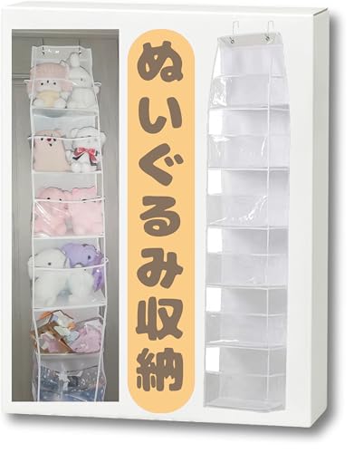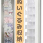 ぬいぐるみを収納するためのウォールポケット。壁掛けやドア掛けが可能で、白色の6段タイプ。大容量の収納棚としてぬいぐるみストッカーに最適。