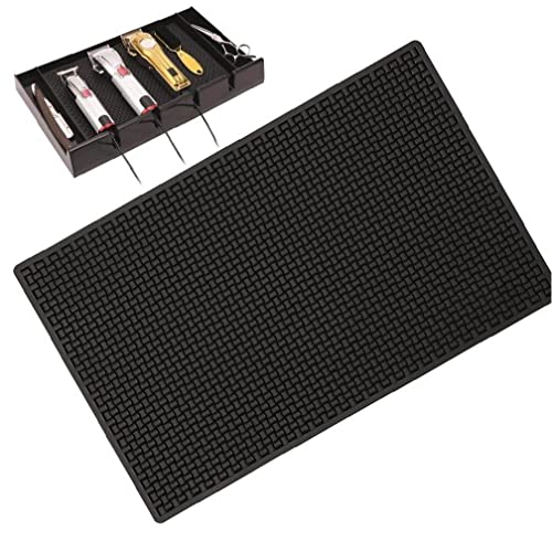 ミニ理美容ツールパッドは、ノンスリップ素材で作られた散髪道具用マット。バリカンやハサミ、トリマーを安全に収納し、ホルダー機能で道具が横滑りしない設計。理容室や自宅での理美容作業を快適にサポート。