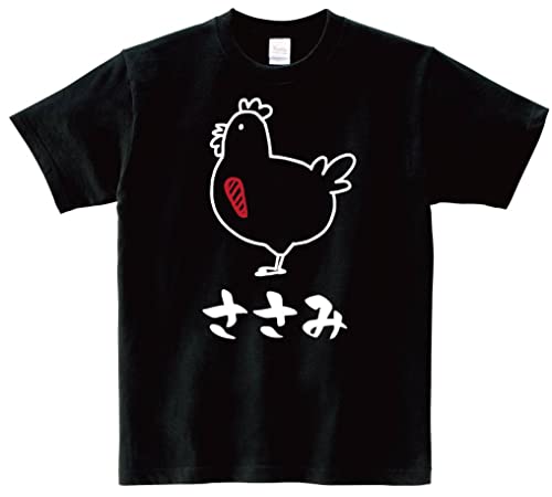サモエスキーのTシャツは、ささみや鶏肉をテーマにしたユニークなデザイン。焼鳥部位のイラストがプリントされた半袖ブラックのLサイズ。鶏肉ファンにぴったりの一品!