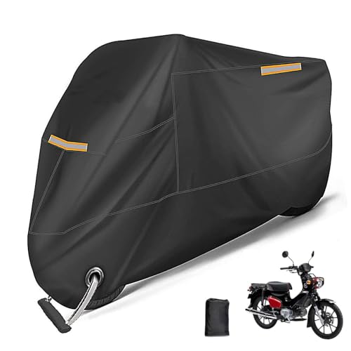 ホンダクロスカブ110専用のバイクカバー。UVカット・凍結防止機能付き。盗難防止のロック穴&ワンタッチバックル装備。3反射ストリップで安全性アップ。オールシーズン対応のLサイズ、ブラック。
