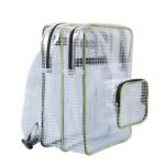 リュックタイプの透明バッグ。エンジニア向けで大容量の道具袋。PVC素材、帯電防止機能、クリーンルーム対応。工具収納に最適で、防水性もあり、丈夫で長持ち。サイズ45×35×20cm、色はグリーン。