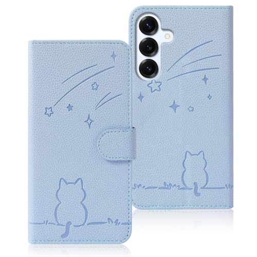 Rosbtib Galaxy S25/S24ケースは、流れ星子猫デザインの手帳型で、耐衝撃性があり、カード収納も可能。軽量かつ耐久性に優れ、スタンド機能付き。PUレザー製、マグネット開閉、6.2インチ対応(ブルー)。