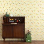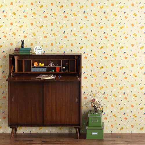 壁紙屋本舗の壁紙シールは、剥がせるタイプでアデリアとのコラボ商品です。おしゃれなレトロデザインの黄色(イエロー)で、10柄のミックスフルカラー仕様。サイズは49cm×2.5m、おまけのスムーサー付き。受注生産品のためキャンセル不可です。