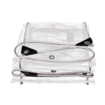 透明PVC製の防水シート。450g/㎡の引き裂き抵抗を備え、サイズは1.5mX1.9m。豪雨対策や植物保護、寒風防止、花粉症対策に最適。業務用としても利用可能で、保護ロープ付き。