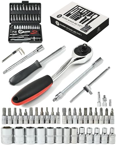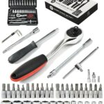 GEARMANのソケットレンチセットは、差込角6.35mm(1/4インチ)で、72ギアのラチェットシステムを搭載。46種類のソケットが含まれ、クイックリリースラチェットハンドルが特長の便利な工具セットです。