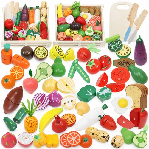 Rocottoおままごとセットは食品衛生法検査済の木製おもちゃ。マグネットとマジックテープで切れる野菜や果物が含まれ、大容量の収納木箱付き。子供のごっこ遊びに最適な知育玩具です。