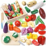 Rocottoのおままごとセットは、木製の野菜や果物が含まれた大容量の知育玩具。マグネットとマジックテープで切る楽しさを提供し、収納木箱付き。幼児向けのごっこ遊びに最適です。