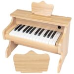名入れ可のミニ木製電子ピアノ。25鍵盤のデジタルピアノで譜面台付き。単三電池使用、ノイズ軽減で静かな演奏が可能。おもちゃとしても楽しめる小サイズ。