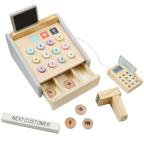 Rocottoの木製レジスターセットは、おままごとやごっこ遊びに最適なおもちゃです。食品衛生取得済で、安全に遊べる知育玩具。幼児や子供におすすめ。ラッピングなしの01番タイプ。