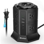 Micshionの延長コード2M、電源タップタワー。8個AC口、2つのUSB-Cポートと2つのUSB-Aポートを装備。個別スイッチ型、雷ガード、過負荷保護、2層設計で省エネ。ブラックカラー。