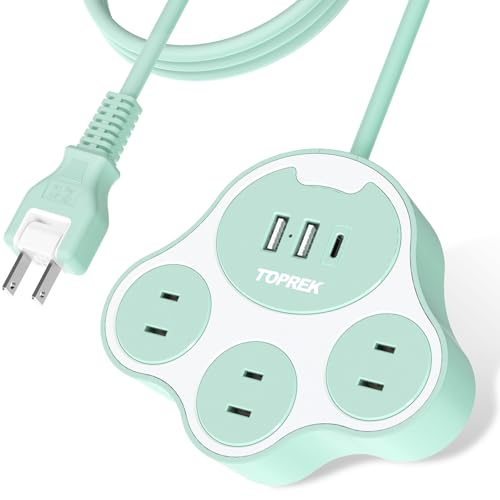 TOPREK猫の足型電源タップは、1.5Mで3個AC口、2個USB-A、1個USB-C(20W PD3.0急速充電)を搭載。1500W/12A対応、180°スイングプラグ、雷サージガード付きで、オフィスや家庭、旅行に最適。