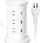 NVEESHOXの電源タップは、Type-C付きで延長コード機能を備えたタワー型。12個のAC口、3つのUSBポートを持ち、雷ガード機能付き。安全保護機能があり、自宅や会社での使用に最適。