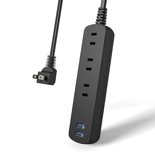 TOPLANDの延長コードは、ACコンセント3口とUSBポート2口を備えたスリムタイプ。長さ2m、カラーはブラック。デバイスの充電に便利です。