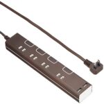 USB電源タップはAC4口を備え、1.5mのケーブルで便利に配置可能。ブラウンのデザインで、インテリアにもマッチしやすい。充電ポートでスマホやタブレットも同時に充電できる。