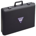 メイホウ(MEIHO)のアタッシェケースは、ブラックカラーで内寸450x320x75mm(蓋底100mm)でA3サイズに対応。耐久性と使い勝手を兼ね備えたデザインが特長です。