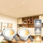 POOPEEの屋内用LEDダウンライトは、埋込穴100φの天井埋込型で、昼光色、電球色、昼白色の3段階調色が可能。高気密SB形で浅型6H、5W、500LMで白熱球40形相当の明るさ。リビングや寝室、キッチンなどに最適な2個セット。