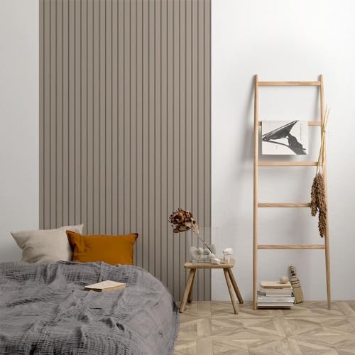 壁紙屋本舗の剥がせる壁紙シール。木目調でおしゃれな茶色とグレーのスラットウォール。サイズは49cm×2.5mで、おまけのスムーサー付き。受注生産品のためキャンセル不可。