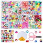 ポリマークレイビーズブレスレット製作キット。600個のビーズを含み、24スタイル(フルーツ、花、動物、ハート、マッシュルーム)。ポニービーズやキャンディアルファベットビーズもあり、ネックレスやイヤリングの制作に最適です。