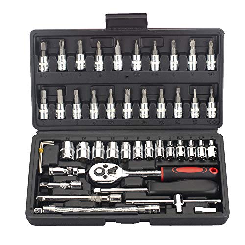 このソケットレンチセットは、差込角6.3㎜(1/4インチ)で46点の工具を含み、自動車や自転車の修理、DIY作業に最適です。45ギヤのラチェット機構で迅速な作業が可能です。