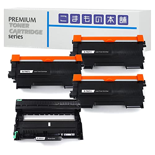 こまもの本舗のブラザー用TN-27J互換トナー3本とDR-22J互換ドラムのセット。ISO認証工場製造で、高品質。対応機種はDCP-7060D、DCP-7065DN、FAX-2840、FAX-7860DW、HL-2240D、HL-2270DW、MFC-7460DNです。