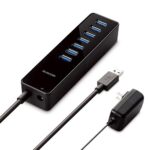 エレコム USB3.0ハブ(7ポート、ACアダプタ付)はセルフパワータイプで、マグネット付き。MacBook、Surface Pro、Chromebook、ノートPC、Nintendo Switchに対応。カラーはブラック。