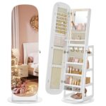 SONGMICS LEDジュエリーキャビネットは360度回転式で、ロック可能なミラーを備えています。収納棚付きで、クラウドホワイトのデザインが魅力的です。