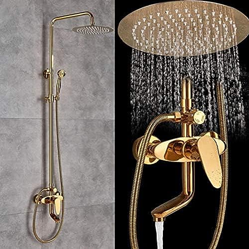 ラグジュアリー8インチレインフォールバスシャワーセット。壁取り付け型のハンドシャワーと回転スパウト付き。ゴールド仕上げで、美しいデザイン。高品質のミキサータップが特徴。