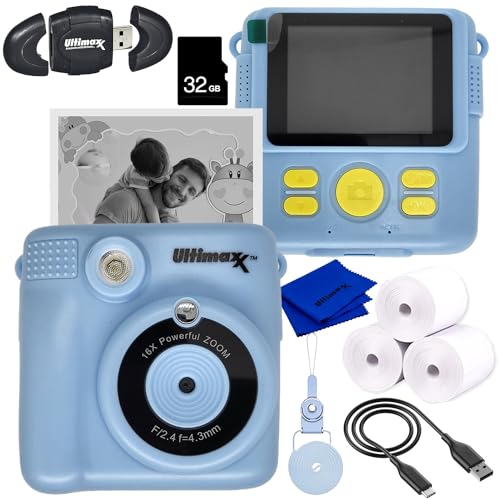 Ultimaxx Essential インスタントプリントカメラ(ブルー)は、子供用に最適。32GB microSDカード、高速メモリーカードリーダー、内蔵microSDスロット、ランヤード、マイクロファイバークロスなどが含まれる9個セット。