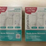 プロアクティブ トライアルキットは、30日分のスキンケア製品が2セット入っています。ニキビ対策に特化した洗顔料、化粧水、クリームが含まれ、清潔で健やかな肌を目指します。