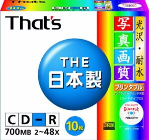 太陽誘電製 That’s CD-Rデータ用 48倍速700MB 光沢・耐水写真画質ワイドプリンタブル 5mmPケース10枚入 CDR80WKY10SV