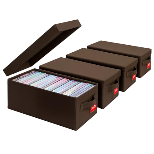 Tapetinel DVDストレージボックス4個セット。茶色の丈夫なデザインで、蓋付き。標準DVDケース25個収納可能。DVD、CD、ゲーム用の積み重ね可能なオーガナイザー。