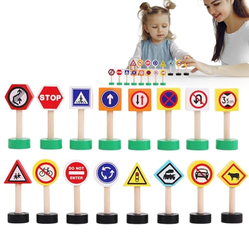子供用交通標識おもちゃ16ピースセット。木製で積み木感覚の楽しい早期学習ゲーム。パーティーや教育の場に最適な安全テーマのアイテム。