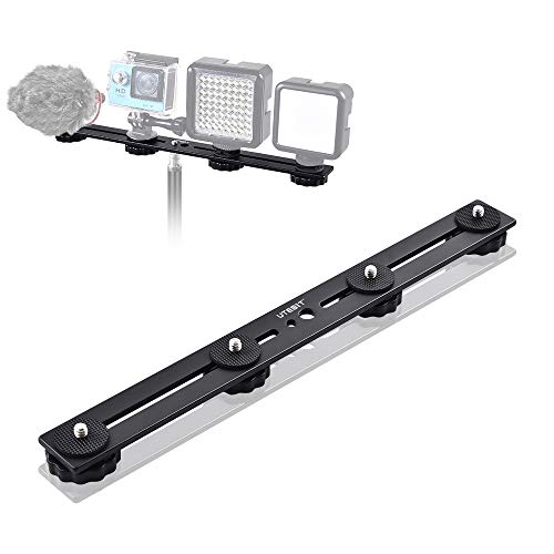 UTEBITカメラシューブラケットは、30cmのアルミ合金製延長プレートで、4台のカメラを取り付け可能。1/4と3/8インチネジ穴対応、ビデオライトやストロボにも対応。