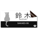 マグネットタイプの表札ステッカー。かわいいにゃんこデザインで、屋外対応・取り外し可能。賃貸やマンションのポスト、玄関に最適。名前や住所をオーダーできます。