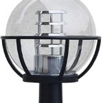 モダンでシンプルなデザインのエクステリアポーランタン。透明ボール形状で防雨仕様、耐久性のある金属製。庭や池まわりに最適な防錆ポストライト、アウトドアにも適用。