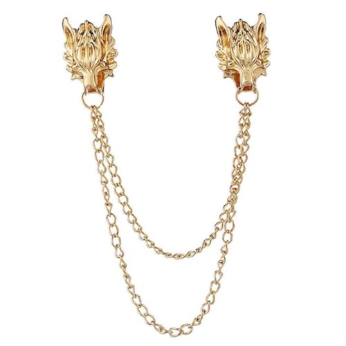 ラペルピン 襟ブローチ。狼頭のデザインが特徴で、チェーンブローチ付き。スーツやコート、シャツに最適。記念日や父の日の贈り物にもおすすめのゴールド仕上げ。男性用のスタイリッシュなアクセサリー。