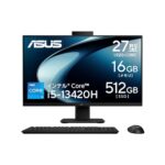 ASUS V400 AiO V470VAKは、27インチディスプレイ、Intel Core i5 13420H、16GBメモリ、512GB SSDを搭載。USBキーボードとマウス、外付けDVDドライブ付属。