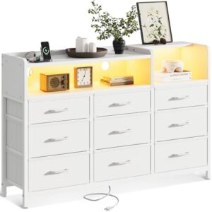 AODK タンス チェスト 衣裝ケース 収納ケース 衣装棚 洋服収納 led付き 引き出し9杯付き コンセント付き 脱衣所 棚 衣類チェスト 洋服タンス 箪笥 たんす 木製天板付き 和風 リビング 安定感 大容量(ホワイト, 幅130×奥行30×高さ97cm)