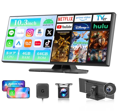 VANBARの10.26インチAndroidポータブルナビは、2画面表示でYouTube視聴可能。Android14、8コアCPU、4GB RAM、64GB ROM搭載。ドライブレコーダー機能、CarPlay、Android Auto、WiFi、ワイヤレスミラーリング対応。