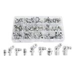 115ピースのスチール製グリースニップル継手キット。ストレート、90度、45°傾斜(M6、M8、M10)を完備し、精緻な設計が特長。多様なニーズに対応します。