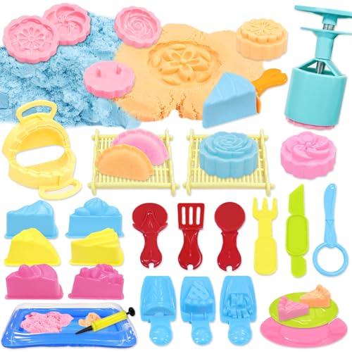 VBACALA 砂遊び シルキーサンド 38PCS お砂場セット 室内で遊べる砂 カラフル 砂粘土 和菓子 ケーキ定番 押し型 ヘラ 竹皿 ケース付き おうち 散らからない 砂 おもちゃ 砂場遊び クリスマス プレゼントの製品情報