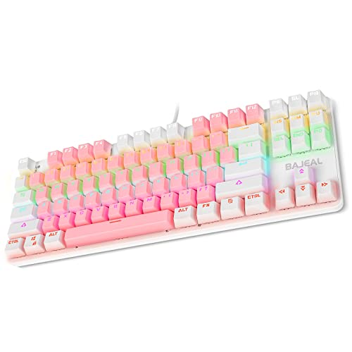 メカニカル式ゲーミングキーボード、青軸87キー、US配列、USB有線、RGBバックライト、防水仕様。人間工学デザインで打ちやすく、PCやノートパソコン、Windowsに対応し、ピンクカラーが特徴。