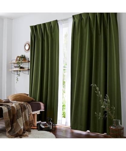 ニッセンのカーテンは、省エネ・節電に優れた1級遮光で、遮熱・防音効果もあります。ヘリンボーン織柄のモスグリーンで、サイズは幅100cm×長さ135cmが2枚セットです。