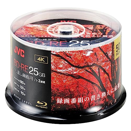 ビクター JVCのBD-RE 25GBは、片面1層で1-2倍速に対応。50枚入りで、国内主要メーカーのレコーダーでの動作確認済み。ホワイトディスク VBE130NP50SC2。