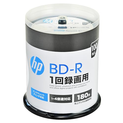 ヒューレット・パッカードの1回録画用ブルーレイディスクBD-Rは、25GB容量の100枚パックです。インクジェットプリンタ対応のホワイト面で、片面1層、1-4倍速での書き込みが可能です。