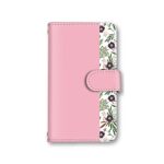 スマ通 らくらくスマートフォン (F-53E) 用の手帳型ケース。カードポケット&ミラー付き、花柄デザイン。スタンド形式で使いやすく、ストラップ穴も完備。耐衝撃で可愛らしいベビーピンク色。